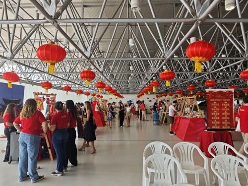 活动在帕州文化宫举行,从入口到开幕式礼堂,沿途皆用红灯笼装饰。入口处设置了一个摄影展,每一张照片都是帕拉伊巴联邦大学的老师亲自摄于中国,并在其上巧妙地覆盖了金色丝线。