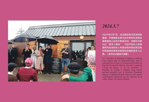 另一张拍摄于2024年5月7日。应法国总统马克龙特别邀请,习近平主席乘专机来到法国西南部上比利牛斯省访问。在图尔马莱山口“牧羊人驿站”,习近平和夫人彭丽媛同马克龙和夫人布丽吉特共同欣赏当地村民表演的具有浓郁南法风情的牧羊人之舞。照片中,热情洋溢的民族舞蹈与元首外交的热烈庄重交相辉映,飞舞的雪花更为这一历史时刻增添了喜庆祥和的氛围,中法两国元首、人民密切联系、相知相亲的美好瞬间在此刻定格。