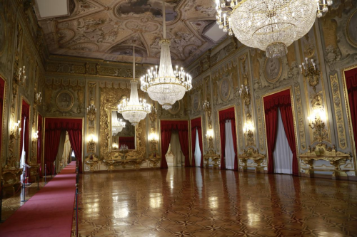 行至宴会大厅,使馆一行不由放慢脚步。宴会大厅是意大利总统为来访外国元首举行国宴的地方,也是总统府里仅次于骑士大厅的第二大厅,可容纳三百余人。天顶中央壁画里,象征意大利统一的女神手持三色旗端坐于宝座上。三盏巨大的水晶灯垂挂厅中,璀璨的灯影在厅两端的镜面间荡漾。红色天鹅绒窗帘,金色家具,陈设尽显格调。在这样的厅堂里设宴款待来访元首,是对宾客的最高礼遇,觥筹交错之间,便能表达友好、营造氛围、促进合作。