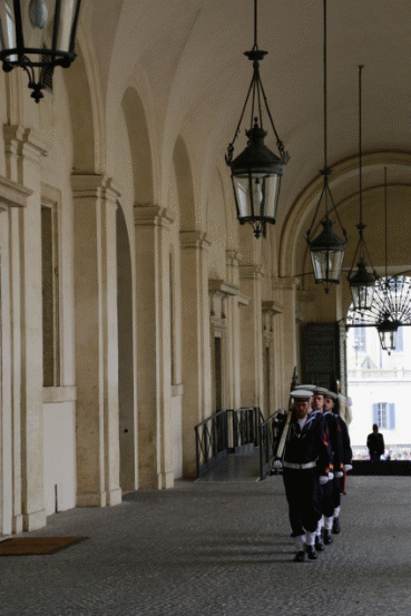 使馆一行抓住这次参访交流的宝贵机会,全面了解意大利总统府内各处用途功能与历史演变,直观地认识到总统作为国家元首在意大利政治中的角色定位,对驻在国的制度产生了更深刻的理解和体会。参访接近尾声,使馆一行来到总统府庭院的柱廊下,恰逢总统仪仗队的几位官兵踏着整齐的步伐走过。馆员们再次联想起习主席国事访问时总统府的盛况,不由得心潮澎湃,更加坚定了作为外交人员的使命感、责任感。
