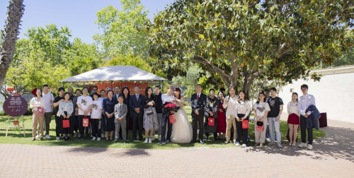 孟总领事与新人将共同书写的祝福卡悬挂在硕果累累的枇杷树上。微风拂过,阳光洒落,张张卡片摇曳起舞,仿佛在低诉爱的誓言,也将这一刻的温情悄然珍藏。新人手持捧花,纷纷合影留念,记录美好时刻。