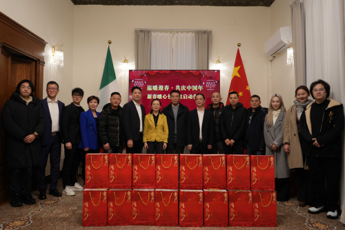 2026年1月28日,驻佛罗伦萨总领馆举办“温暖迎春·共庆中国年”新春暖心包发放启动仪式。驻佛罗伦萨总领事尹琦向侨界及留学生代表致以新春祝福,并发放暖心包。