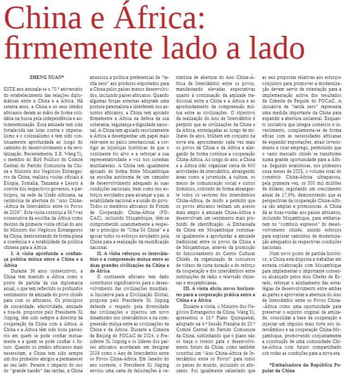 2026年1月30日,驻莫桑比克大使郑璇在莫《消息报》发表署名文章《中国和非洲坚定站在一起》,全文如下: