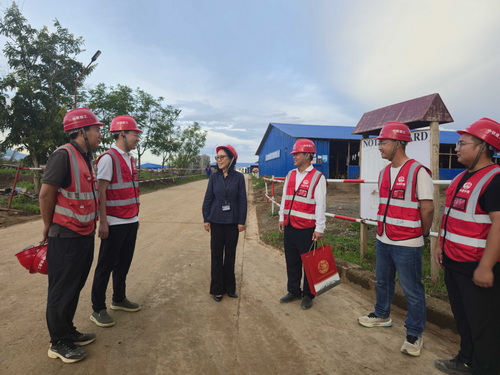 陈大使实地考察项目建设进展,详细了解施工情况,并与项目负责人和员工代表交流。陈大使传达党中央、国务院对海外中国公民和机构的关心关爱,要求企业安全生产、合规经营,积极履行社会责任,为中坦友好贡献力量。