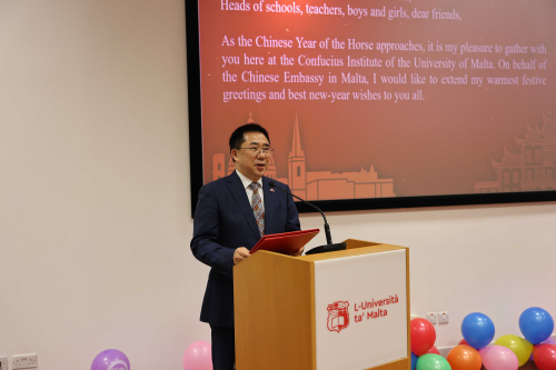 2026214日,驻马耳他大使张佐应邀出席马耳他大学孔子学院春节晚会并致辞。马大校长维拉、副校长贝齐纳、马教育部人文教育司长米凯勒夫、孔院中方院长聂爱霞、外方院长米兹及200余名师生参加。