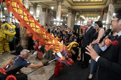 现场舞龙舞狮、古筝弹奏动静相宜,中国古典舞与探戈相得益彰,丙午马年春节主题旅游巴士吸引民众驻足围观,气氛喜庆,年味浓厚。