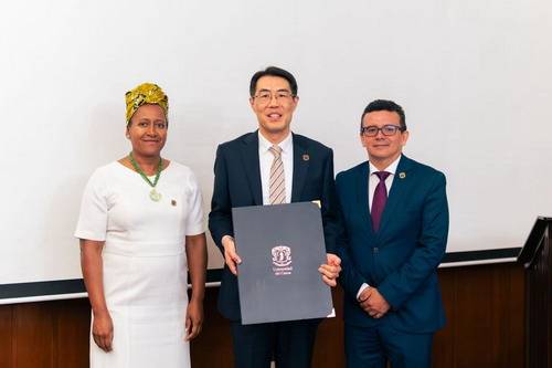 考卡大学建于1827年,是哥伦比亚历史最悠久的公立大学。朱大使接受校长颁发的荣誉证书。