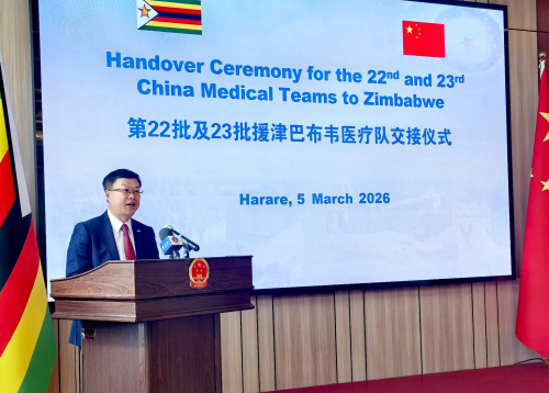 2026年3月5日,驻津巴布韦大使周鼎与津卫生和儿童福利部代理常秘尼亚马亚罗共同出席第22批与23批中国援津医疗队交接仪式。