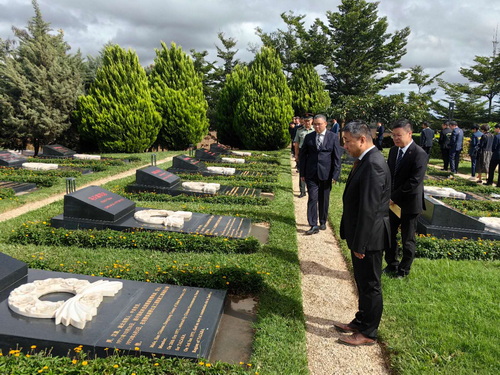 纪念园内,烈士纪念碑巍然矗立,“中国援赞烈士永垂不朽”十个大字铭刻其上。全体同志向烈士们鞠躬默哀,敬献鲜花,气氛庄严肃穆。