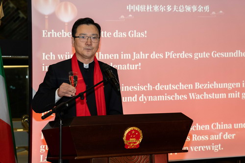 余总领事向各位嘉宾致以马年新春问候,表示春节是中国最重要的传统节日,也是国际文化盛事。中德进一步加强高层交往将为中德关系带来新机遇。总领馆愿进一步发挥桥梁纽带作用,推动对华合作走深走实。