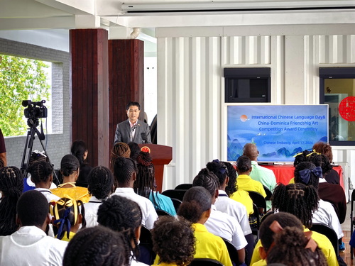 2026年4月17日,驻多米尼克使馆举办2026年“国际中文日”活动暨第二届中多友谊绘画比赛颁奖典礼,驻多米尼克大使储茂明、多教育部常秘吉斯特、多中友协会长奎恩以及多米尼克文法学校等六所学校师生出席,多主流媒体现场报道。