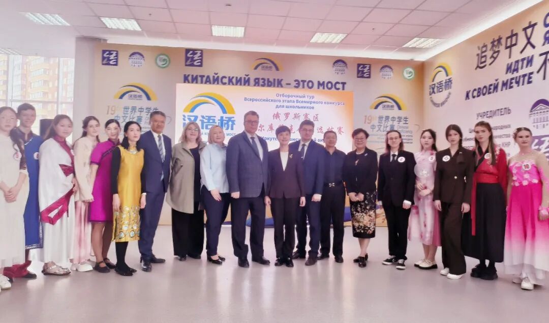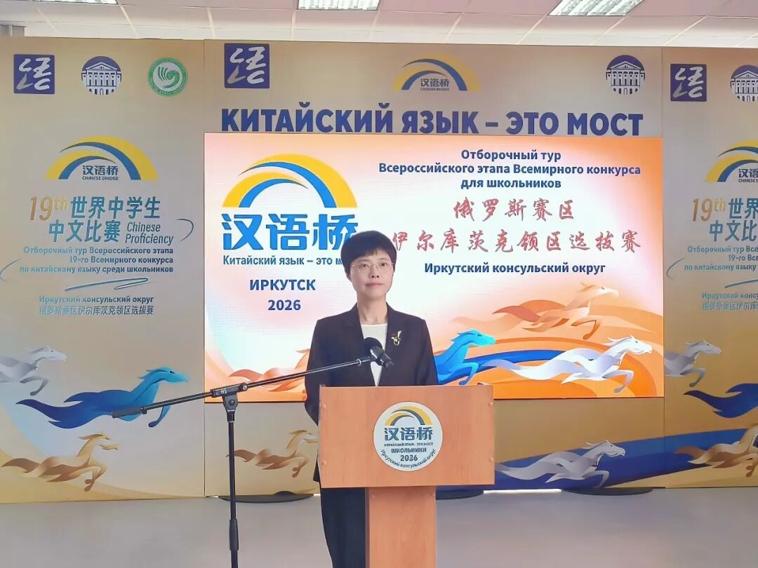 2026年4月17日,由驻伊尔库茨克总领馆主办、伊尔库茨克国立大学孔子学院承办的2026年全俄中学生“汉语桥”中文比赛领区选拔赛在伊国大举行。驻伊尔库茨克总领事刘渝、伊国大副校长格里巴诺夫、俄外交部驻伊尔库茨克代表科捷利尼科夫出席并致辞。