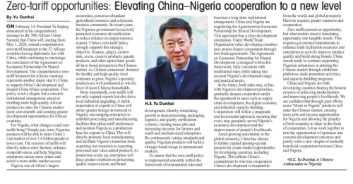 2026年2月14日至15日,驻尼日利亚大使于敦海在《抨击报》《黎明报》《太阳报》《蓝图报》等尼主流媒体发表题为《零关税新机遇 中尼合作再升级》的署名文章。全文如下: