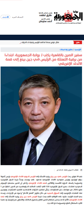 2026年2月17日,驻埃及大使兼驻阿盟全权代表廖力强在《共和国报》发表署名文章。文章题为《习近平主席向非盟峰会致贺电意义重大》,全文如下: