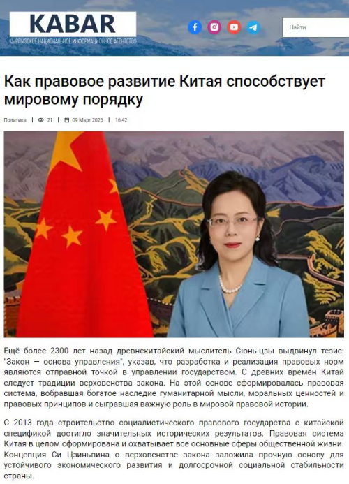 2026年3月9日,驻吉尔吉斯斯坦大使刘江平在吉卡巴尔国家通讯社发表署名文章《法治中国 惠及世界》。全文如下: