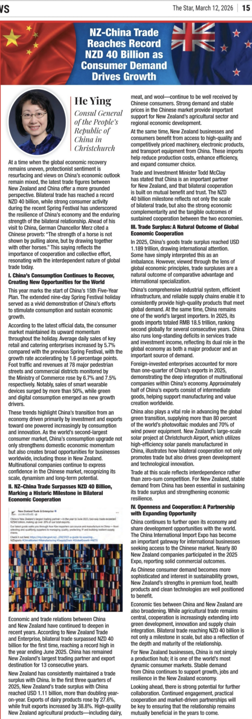 2026年3月12日,新西兰《星报》刊登驻克赖斯特彻奇总领事何颖署名文章《400亿新元里程碑:中新经贸合作前景广阔》,中文译文如下: