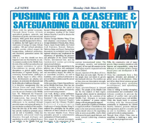 2026年3月16日,驻非盟使团团长蒋烽与驻塞拉利昂大使赵勇在塞主流媒体《洞察报》、《卡拉巴什报》发表题为《推动停火止战,维护共同安全》的联合署名文章。全文如下: