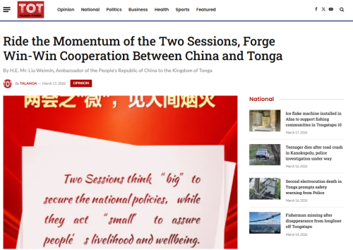 2026年3月17日,驻汤加大使刘为民在汤加主流媒体“TOT新闻网”发表署名文章《乘两会东风 谋中汤共赢》,阐释两会重要政治意义,宣介中国理念、中国势能与中国机遇。期待推进“十五五”规划同《汤加战略发展框架(2025-2035)》对接,同汤加守望相助、携手共进,推动中汤全面战略伙伴关系走深走实,为构建人类命运共同体贡献力量。全文如下: