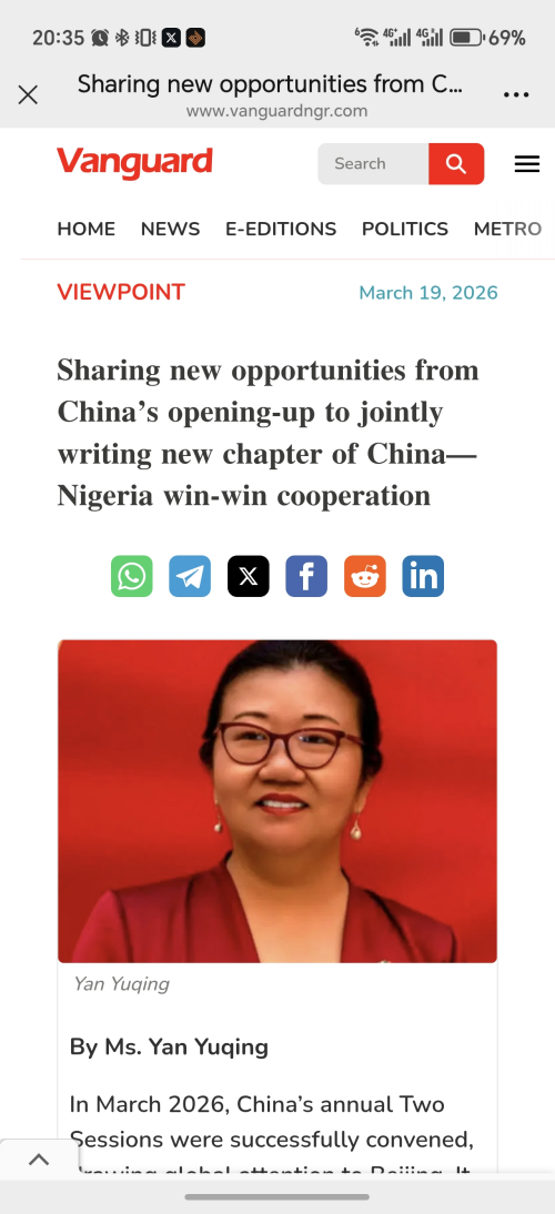自2026年3月中旬起,尼日利亚《先锋报》《独立报》《卫报》、非中媒体中心等当地主流媒体及《西非统一商报》《西非华声报》和《西非华文报》等华文媒体陆续刊登驻拉各斯总领事严宇清署名文章《共享中国对外开放新机遇 共谱中尼合作共赢新篇章》,宣介两会和王毅外长记者会精神。全文如下: