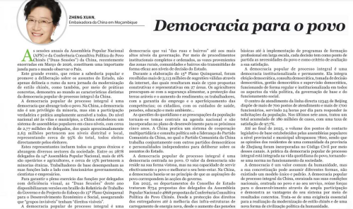驻莫桑比克大使郑璇在莫《国家报》发表署名文章《民主为了人民:从“两会”看中国全过程人民民主》