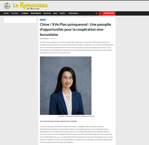 2026年4月3日,驻布隆迪大使朱克玮在布隆迪官方报《新生报》发表署名文章《“十五五规划”:中国同布隆迪的合作机遇清单》,全文如下: