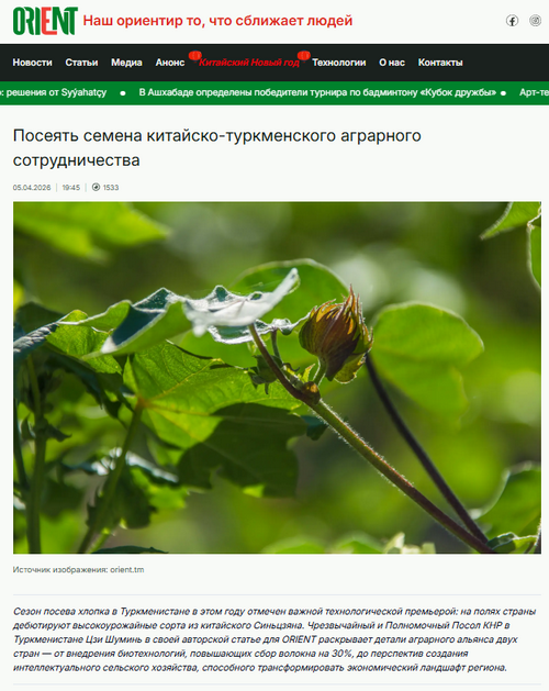 2026年4月5日,驻土库曼斯坦大使吉树民在“东方网”发表署名文章《播下中土农业合作的种子》,宣介“十五五”规划内容,展望中土农业合作前景。全文如下: