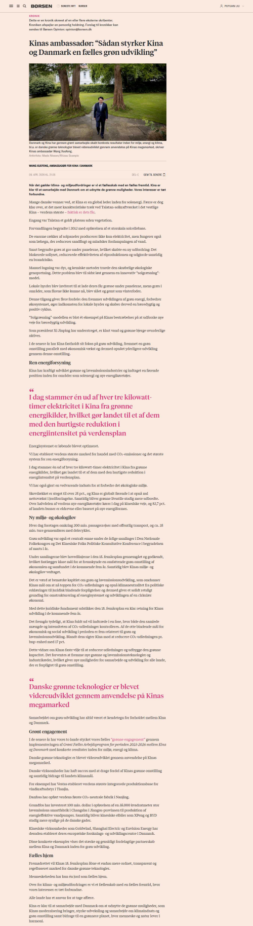 驻丹麦大使王雪峰在丹媒体发表署名文章《逐绿向新——中丹携手迈向可持续未来》