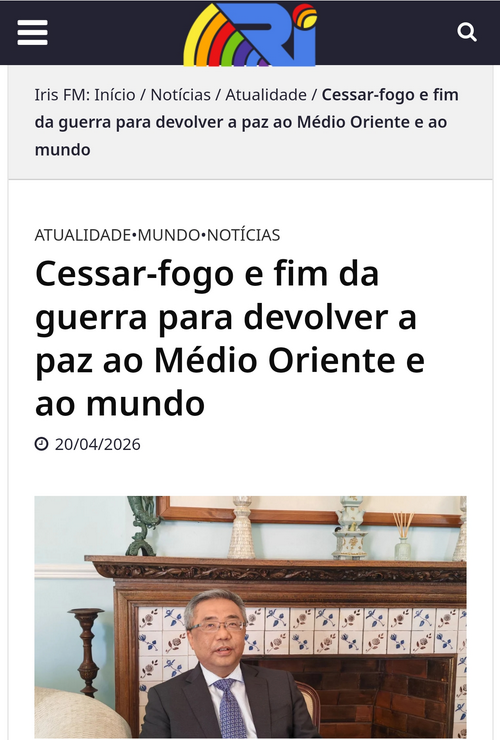 2026年4月20日,驻葡萄牙大使杨义瑞在葡萄牙媒体彩虹网上发表署名文章《停火止战,还中东和世界以和平》,全文如下: