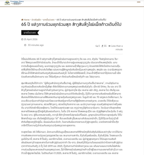 2026年4月24日至4月25日,在中老建交65周年(1961年4月25日-2026年4月25日)之际,驻老挝大使方虹在老挝党中央机关报《人民报》、《万象时报》、国家电台等主要媒体发表题为《六十五载风雨同舟,万象更新再启征程》的署名文章。文章全文如下: