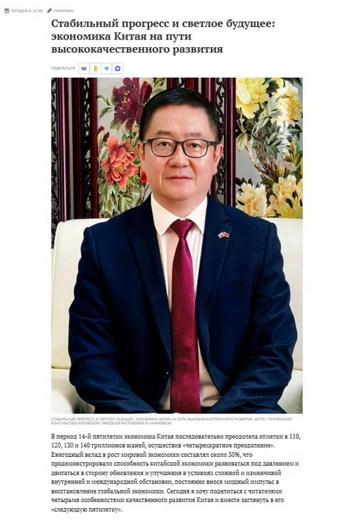 2026年4月24日,驻哈巴罗夫斯克总领事姜笑洋在驻哈巴罗夫斯克总领馆领区主流媒体《莫斯科共青团员报》发表署名文章《中国经济稳中有进,高质量发展前景光明》,全文如下: