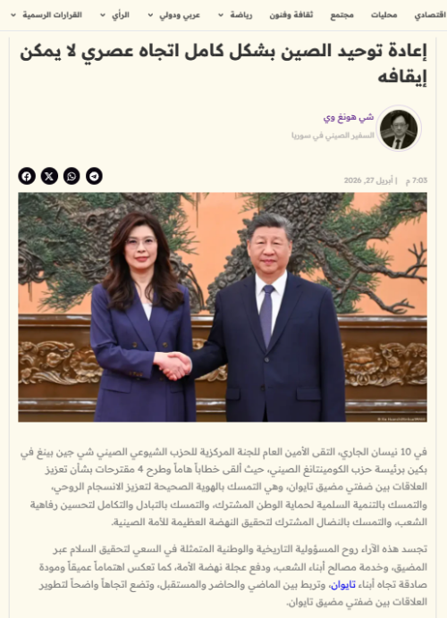 2026年4月27日,驻叙利亚大使史宏微在叙利亚《革命报》发表署名文章《中国完全统一的时代洪流不可阻挡》,文章全文如下: