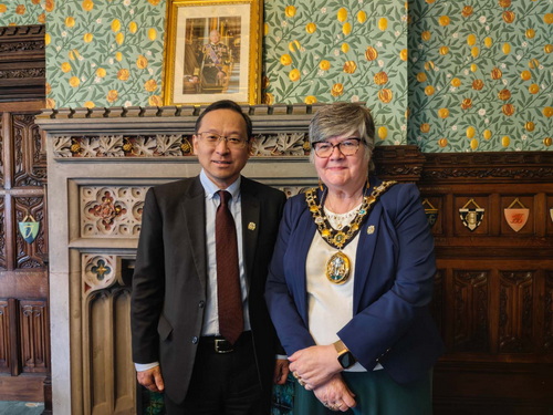 埃姆斯利市长欢迎唐锐总领事到访,表示作为大曼彻斯特下辖10个市之一,罗奇代尔期待发展对华关系,愿同总领馆一道推动双方在经贸、科技、教育、旅游等领域深化合作,为双方民众带来切实利益。