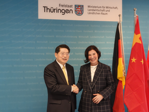 邓大使表示,默茨总理前不久成功访华,两国领导人就中德关系发展达成重要共识,指明前进方向。中德合作互利互惠、前景广阔,图林根州文化底蕴深厚、区位条件独特,希望双方共同书写友好合作新篇章,打造更多地方交往新典范。邓大使向德方介绍了2026年全国两会精神和中方“十五五”规划,强调中国当前正以高质量发展推动中国式现代化,愿以自身发展为包括德国在内的世界各国带来更多机遇。