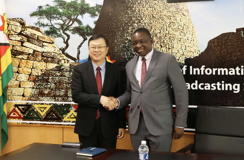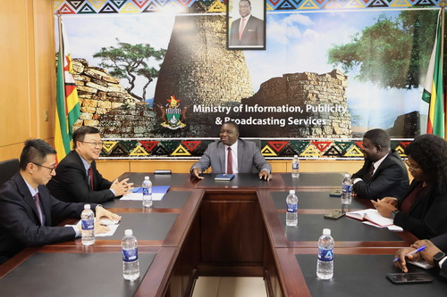 2026年4月27日,驻津巴布韦大使周鼎会见津新闻、宣传和广播服务部长索达,双方就深化两国新闻传播领域合作深入交换意见。